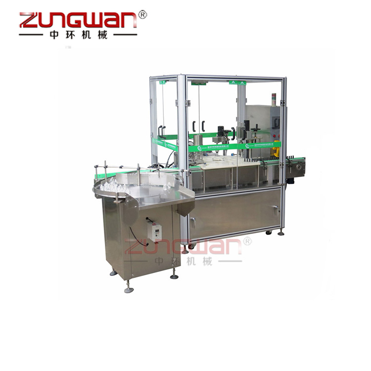 ZHY-50液體灌裝旋蓋機(jī),包括帶有灌裝接頭的灌裝機(jī)構(gòu)、旋蓋配置、灌裝流水線以及沿灌裝流水線運(yùn)動(dòng)且用于固定瓶體的夾具,灌裝流水線上連接有用于控制夾具朝灌裝機(jī)構(gòu)方向運(yùn)動(dòng)的升降機(jī)構(gòu),夾具包括用于固定瓶體的裝夾平臺(tái)以及與灌裝流水線位移配合的行走支架,裝夾平臺(tái)與行走支架轉(zhuǎn)動(dòng)配合,裝夾平臺(tái)與灌裝機(jī)構(gòu)之間設(shè)置有用于使裝夾平臺(tái)繞行走支架頂端左右擺動(dòng)的擺動(dòng)機(jī)構(gòu)。當(dāng)固定有瓶體的夾具運(yùn)動(dòng)至灌裝接頭下方時(shí),利用升降機(jī)構(gòu)瓶體沿豎直方向運(yùn)動(dòng),使得瓶體上端瓶口與灌裝接頭相對(duì)接,在瓶體下降的過(guò)程中,利用擺動(dòng)機(jī)構(gòu),使得裝夾平臺(tái)能夠繞行走支架頂端左右擺動(dòng),進(jìn)而搖晃瓶體內(nèi)部的液體,通過(guò)搖晃使瓶體中液體內(nèi)的氣泡溢出。