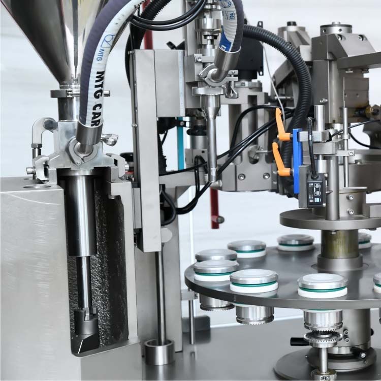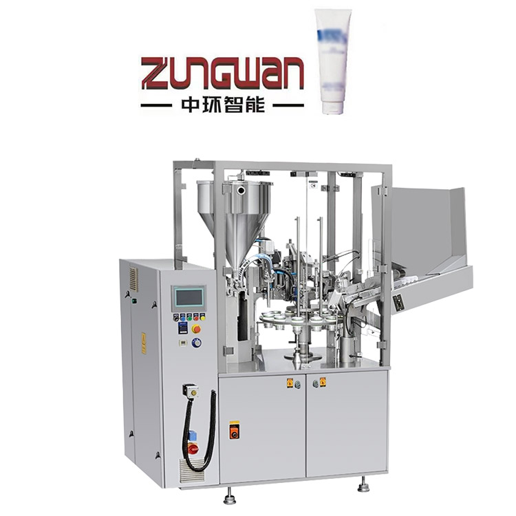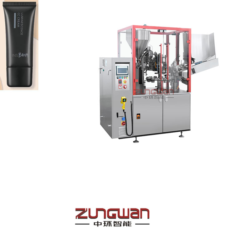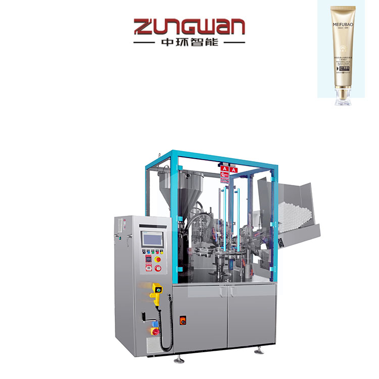 工作流程:管倉(護(hù)膚品軟管) → 自動(dòng)上管(化妝品復(fù)合管) → 識(shí)標(biāo)定位 →軟管(鋁管)內(nèi)部清洗(選項(xiàng))→ 充填 → (鋁塑管)尾部熱熔 → 壓合封尾、打字碼→(金屬管扁尾)→一次折疊→二次折疊→鞍形折疊→剪切(打印字碼)→成品排出。